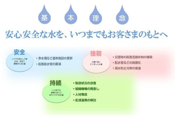 平成30年3月に策定した別府市水道事業ビジョンにおいて「安心安全な水をいつまでもお客さまのもとへ」を基本理念に「目標設定」そして、「実現方策」を掲げました。